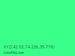 XYZ 42.02,74.226,35.779 Color is a light green color and the nearest color is Very Light Malachite Green #64e986. Hex code #3aff89 and RGB value is rgb(58,255,137). In RGB color space, this color is composed of 23% red, 100% green, 54% blue, In CMYK color space, this color is composed of 77% cyan, 0% magenta, 46% yellow , 0% black , In HSL color space, this color has a hue angle of 144° , 100% saturation and 61% lightness.