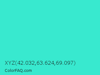 XYZ 42.032,63.624,69.097 Color is a normal cyan color and the nearest color is Turquoise #40e0d0. Hex code #38e9cf and RGB value is rgb(56,233,207). In RGB color space, this color is composed of 22% red, 91% green, 81% blue, In CMYK color space, this color is composed of 76% cyan, 0% magenta, 11% yellow , 9% black , In HSL color space, this color has a hue angle of 171° , 80% saturation and 57% lightness.
