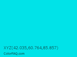 XYZ 42.035,60.764,85.857 Color is a normal cyan color and the nearest color is Bright Turquoise #08e8de. Hex code #00e3e8 and RGB value is rgb(0,227,232). In RGB color space, this color is composed of 0% red, 89% green, 91% blue, In CMYK color space, this color is composed of 100% cyan, 2% magenta, 0% yellow , 9% black , In HSL color space, this color has a hue angle of 181° , 100% saturation and 45% lightness.