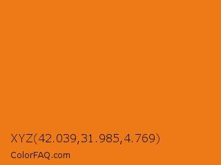 XYZ 42.039,31.985,4.769 Color is a normal orange color and the nearest color is Tango #ed7a1c. Hex code #ed7a17 and RGB value is rgb(237,122,23). In RGB color space, this color is composed of 93% red, 48% green, 9% blue, In CMYK color space, this color is composed of 0% cyan, 49% magenta, 90% yellow , 7% black , In HSL color space, this color has a hue angle of 28° , 86% saturation and 51% lightness.