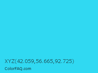 XYZ 42.059,56.665,92.725 Color is a normal cyan color and the nearest color is Turquoise #40e0d0. Hex code #30d9f2 and RGB value is rgb(48,217,242). In RGB color space, this color is composed of 19% red, 85% green, 95% blue, In CMYK color space, this color is composed of 80% cyan, 10% magenta, 0% yellow , 5% black , In HSL color space, this color has a hue angle of 188° , 88% saturation and 57% lightness.