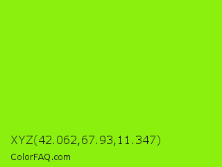 XYZ 42.062,67.93,11.347 Color is a normal green color and the nearest color is Alien Armpit #84de02. Hex code #8cf00f and RGB value is rgb(140,240,15). In RGB color space, this color is composed of 55% red, 94% green, 6% blue, In CMYK color space, this color is composed of 42% cyan, 0% magenta, 94% yellow , 6% black , In HSL color space, this color has a hue angle of 87° , 88% saturation and 50% lightness.