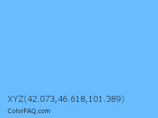 XYZ 42.073,46.618,101.389 Color is a light blue color and the nearest color is Maya Blue #73c2fb. Hex code #69bdff and RGB value is rgb(105,189,255). In RGB color space, this color is composed of 41% red, 74% green, 100% blue, In CMYK color space, this color is composed of 59% cyan, 26% magenta, 0% yellow , 0% black , In HSL color space, this color has a hue angle of 206° , 100% saturation and 71% lightness.
