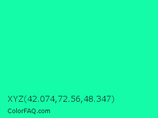 XYZ 42.074,72.56,48.347 Color is a normal green color and the nearest color is Medium Spring Green #00fa9a. Hex code #14fca7 and RGB value is rgb(20,252,167). In RGB color space, this color is composed of 8% red, 99% green, 65% blue, In CMYK color space, this color is composed of 92% cyan, 0% magenta, 34% yellow , 1% black , In HSL color space, this color has a hue angle of 158° , 97% saturation and 53% lightness.