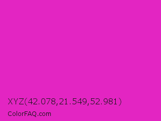 XYZ 42.078,21.549,52.981 Color is a normal magenta color and the nearest color is Steel Pink #cc33cc. Hex code #e325c2 and RGB value is rgb(227,37,194). In RGB color space, this color is composed of 89% red, 15% green, 76% blue, In CMYK color space, this color is composed of 0% cyan, 84% magenta, 15% yellow , 11% black , In HSL color space, this color has a hue angle of 310° , 77% saturation and 52% lightness.
