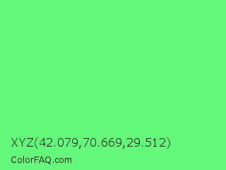 XYZ 42.079,70.669,29.512 Color is a light green color and the nearest color is Very Light Malachite Green #64e986. Hex code #65f779 and RGB value is rgb(101,247,121). In RGB color space, this color is composed of 40% red, 97% green, 47% blue, In CMYK color space, this color is composed of 59% cyan, 0% magenta, 51% yellow , 3% black , In HSL color space, this color has a hue angle of 128° , 90% saturation and 68% lightness.