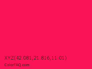 XYZ 42.081,21.816,11.01 Color is a normal rose color and the nearest color is Awesome #ff2052. Hex code #fc1257 and RGB value is rgb(252,18,87). In RGB color space, this color is composed of 99% red, 7% green, 34% blue, In CMYK color space, this color is composed of 0% cyan, 93% magenta, 65% yellow , 1% black , In HSL color space, this color has a hue angle of 342° , 98% saturation and 53% lightness.
