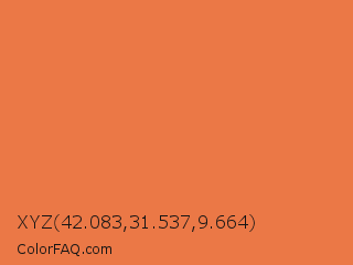 XYZ 42.083,31.537,9.664 Color is a normal orange color and the nearest color is Mandarin #f37a48. Hex code #eb7846 and RGB value is rgb(235,120,70). In RGB color space, this color is composed of 92% red, 47% green, 27% blue, In CMYK color space, this color is composed of 0% cyan, 49% magenta, 70% yellow , 8% black , In HSL color space, this color has a hue angle of 18° , 80% saturation and 60% lightness.