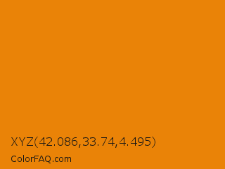 XYZ 42.086,33.74,4.495 Color is a normal orange color and the nearest color is Tahiti Gold #e97c07. Hex code #ea8307 and RGB value is rgb(234,131,7). In RGB color space, this color is composed of 92% red, 51% green, 3% blue, In CMYK color space, this color is composed of 0% cyan, 44% magenta, 97% yellow , 8% black , In HSL color space, this color has a hue angle of 33° , 94% saturation and 47% lightness.