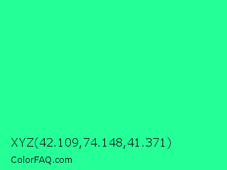 XYZ 42.109,74.148,41.371 Color is a normal green color and the nearest color is Medium Spring Green #00fa9a. Hex code #25ff97 and RGB value is rgb(37,255,151). In RGB color space, this color is composed of 15% red, 100% green, 59% blue, In CMYK color space, this color is composed of 85% cyan, 0% magenta, 41% yellow , 0% black , In HSL color space, this color has a hue angle of 151° , 100% saturation and 57% lightness.