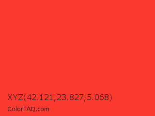 XYZ 42.121,23.827,5.068 Color is a normal red color and the nearest color is Red Orange #ff3f34. Hex code #fc392f and RGB value is rgb(252,57,47). In RGB color space, this color is composed of 99% red, 22% green, 18% blue, In CMYK color space, this color is composed of 0% cyan, 77% magenta, 81% yellow , 1% black , In HSL color space, this color has a hue angle of 3° , 97% saturation and 59% lightness.