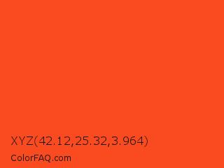 XYZ 42.12,25.32,3.964 Color is a normal red color and the nearest color is Pomegranate #f34723. Hex code #fa4a1f and RGB value is rgb(250,74,31). In RGB color space, this color is composed of 98% red, 29% green, 12% blue, In CMYK color space, this color is composed of 0% cyan, 70% magenta, 88% yellow , 2% black , In HSL color space, this color has a hue angle of 12° , 96% saturation and 55% lightness.