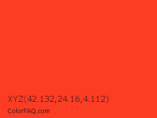 XYZ 42.132,24.16,4.112 Color is a normal red color and the nearest color is Pomegranate #f34723. Hex code #fc3d24 and RGB value is rgb(252,61,36). In RGB color space, this color is composed of 99% red, 24% green, 14% blue, In CMYK color space, this color is composed of 0% cyan, 76% magenta, 86% yellow , 1% black , In HSL color space, this color has a hue angle of 7° , 97% saturation and 56% lightness.