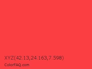 XYZ 42.13,24.163,7.598 Color is a light red color and the nearest color is Coral Red #ff4040. Hex code #fa3e42 and RGB value is rgb(250,62,66). In RGB color space, this color is composed of 98% red, 24% green, 26% blue, In CMYK color space, this color is composed of 0% cyan, 75% magenta, 74% yellow , 2% black , In HSL color space, this color has a hue angle of 359° , 95% saturation and 61% lightness.