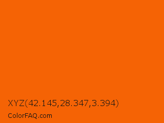 XYZ 42.145,28.347,3.394 Color is a normal orange color and the nearest color is Blaze Orange #ff6600. Hex code #f56305 and RGB value is rgb(245,99,5). In RGB color space, this color is composed of 96% red, 39% green, 2% blue, In CMYK color space, this color is composed of 0% cyan, 60% magenta, 98% yellow , 4% black , In HSL color space, this color has a hue angle of 24° , 96% saturation and 49% lightness.