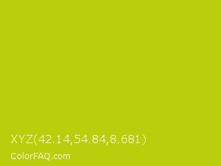 XYZ 42.14,54.84,8.681 Color is a normal yellow color and the nearest color is Rio Grande #bbd009. Hex code #b8cf0b and RGB value is rgb(184,207,11). In RGB color space, this color is composed of 72% red, 81% green, 4% blue, In CMYK color space, this color is composed of 11% cyan, 0% magenta, 95% yellow , 19% black , In HSL color space, this color has a hue angle of 67° , 90% saturation and 43% lightness.