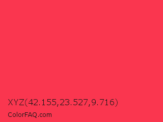XYZ 42.155,23.527,9.716 Color is a normal red color and the nearest color is Red Salsa #fd3a4a. Hex code #fa364f and RGB value is rgb(250,54,79). In RGB color space, this color is composed of 98% red, 21% green, 31% blue, In CMYK color space, this color is composed of 0% cyan, 78% magenta, 68% yellow , 2% black , In HSL color space, this color has a hue angle of 352° , 95% saturation and 60% lightness.