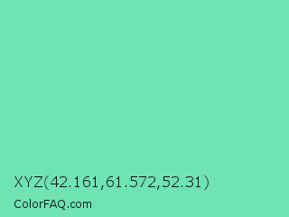 XYZ 42.161,61.572,52.31 Color is a light green color and the nearest color is Medium Aquamarine #66ddaa. Hex code #6fe3b3 and RGB value is rgb(111,227,179). In RGB color space, this color is composed of 44% red, 89% green, 70% blue, In CMYK color space, this color is composed of 51% cyan, 0% magenta, 21% yellow , 11% black , In HSL color space, this color has a hue angle of 155° , 67% saturation and 66% lightness.