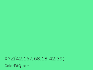 XYZ 42.167,68.18,42.39 Color is a light green color and the nearest color is Very Light Malachite Green #64e986. Hex code #5cf29c and RGB value is rgb(92,242,156). In RGB color space, this color is composed of 36% red, 95% green, 61% blue, In CMYK color space, this color is composed of 62% cyan, 0% magenta, 36% yellow , 5% black , In HSL color space, this color has a hue angle of 146° , 85% saturation and 65% lightness.