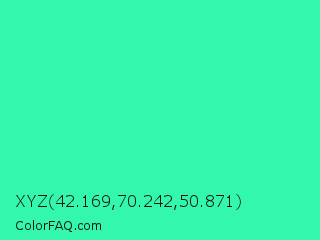 XYZ 42.169,70.242,50.871 Color is a normal green color and the nearest color is Eucalyptus #44d7a8. Hex code #33f7ad and RGB value is rgb(51,247,173). In RGB color space, this color is composed of 20% red, 97% green, 68% blue, In CMYK color space, this color is composed of 79% cyan, 0% magenta, 30% yellow , 3% black , In HSL color space, this color has a hue angle of 157° , 92% saturation and 58% lightness.