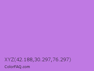 XYZ 42.188,30.297,76.297 Color is a light purple color and the nearest color is Lavender #b57edc. Hex code #bf79e3 and RGB value is rgb(191,121,227). In RGB color space, this color is composed of 75% red, 47% green, 89% blue, In CMYK color space, this color is composed of 16% cyan, 47% magenta, 0% yellow , 11% black , In HSL color space, this color has a hue angle of 280° , 65% saturation and 68% lightness.