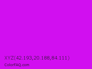XYZ 42.193,20.188,84.111 Color is a normal magenta color and the nearest color is Vivid Orchid #cc00ff. Hex code #d10ff0 and RGB value is rgb(209,15,240). In RGB color space, this color is composed of 82% red, 6% green, 94% blue, In CMYK color space, this color is composed of 13% cyan, 94% magenta, 0% yellow , 6% black , In HSL color space, this color has a hue angle of 292° , 88% saturation and 50% lightness.