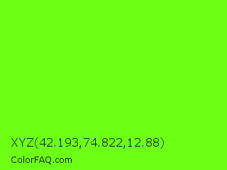 XYZ 42.193,74.822,12.88 Color is a normal green color and the nearest color is Bright Green #66ff00. Hex code #6dff14 and RGB value is rgb(109,255,20). In RGB color space, this color is composed of 43% red, 100% green, 8% blue, In CMYK color space, this color is composed of 57% cyan, 0% magenta, 92% yellow , 0% black , In HSL color space, this color has a hue angle of 97° , 100% saturation and 54% lightness.