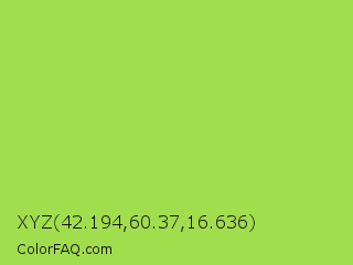 XYZ 42.194,60.37,16.636 Color is a normal green color and the nearest color is Conifer #acdd4d. Hex code #a1de4e and RGB value is rgb(161,222,78). In RGB color space, this color is composed of 63% red, 87% green, 31% blue, In CMYK color space, this color is composed of 27% cyan, 0% magenta, 65% yellow , 13% black , In HSL color space, this color has a hue angle of 85° , 69% saturation and 59% lightness.