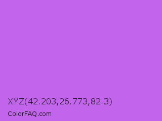 XYZ 42.203,26.773,82.3 Color is a light purple color and the nearest color is Rich Lilac #b666d2. Hex code #c364ec and RGB value is rgb(195,100,236). In RGB color space, this color is composed of 76% red, 39% green, 93% blue, In CMYK color space, this color is composed of 17% cyan, 58% magenta, 0% yellow , 7% black , In HSL color space, this color has a hue angle of 282° , 78% saturation and 66% lightness.