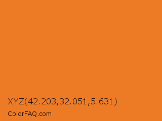 XYZ 42.203,32.051,5.631 Color is a normal orange color and the nearest color is Vivid Tangelo #f07427. Hex code #ed7a24 and RGB value is rgb(237,122,36). In RGB color space, this color is composed of 93% red, 48% green, 14% blue, In CMYK color space, this color is composed of 0% cyan, 49% magenta, 85% yellow , 7% black , In HSL color space, this color has a hue angle of 26° , 85% saturation and 54% lightness.