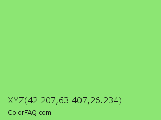 XYZ 42.207,63.407,26.234 Color is a light green color and the nearest color is Pastel Green #77dd77. Hex code #8ce673 and RGB value is rgb(140,230,115). In RGB color space, this color is composed of 55% red, 90% green, 45% blue, In CMYK color space, this color is composed of 39% cyan, 0% magenta, 50% yellow , 10% black , In HSL color space, this color has a hue angle of 107° , 70% saturation and 68% lightness.