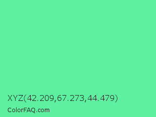 XYZ 42.209,67.273,44.479 Color is a light green color and the nearest color is Medium Aquamarine #66ddaa. Hex code #5ef0a1 and RGB value is rgb(94,240,161). In RGB color space, this color is composed of 37% red, 94% green, 63% blue, In CMYK color space, this color is composed of 61% cyan, 0% magenta, 33% yellow , 6% black , In HSL color space, this color has a hue angle of 148° , 83% saturation and 65% lightness.