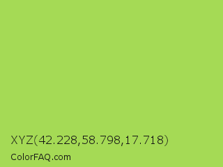 XYZ 42.228,58.798,17.718 Color is a normal green color and the nearest color is Conifer #acdd4d. Hex code #a5da55 and RGB value is rgb(165,218,85). In RGB color space, this color is composed of 65% red, 85% green, 33% blue, In CMYK color space, this color is composed of 24% cyan, 0% magenta, 61% yellow , 15% black , In HSL color space, this color has a hue angle of 84° , 64% saturation and 59% lightness.