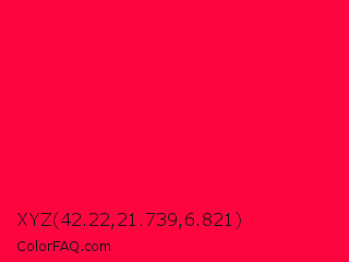 XYZ 42.22,21.739,6.821 Color is a normal red color and the nearest color is American Rose #ff033e. Hex code #ff0540 and RGB value is rgb(255,5,64). In RGB color space, this color is composed of 100% red, 2% green, 25% blue, In CMYK color space, this color is composed of 0% cyan, 98% magenta, 75% yellow , 0% black , In HSL color space, this color has a hue angle of 346° , 100% saturation and 51% lightness.