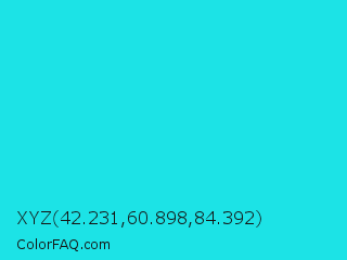 XYZ 42.231,60.898,84.392 Color is a normal cyan color and the nearest color is Bright Turquoise #08e8de. Hex code #1ce3e6 and RGB value is rgb(28,227,230). In RGB color space, this color is composed of 11% red, 89% green, 90% blue, In CMYK color space, this color is composed of 88% cyan, 1% magenta, 0% yellow , 10% black , In HSL color space, this color has a hue angle of 181° , 80% saturation and 51% lightness.