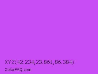 XYZ 42.234,23.861,86.384 Color is a light purple color and the nearest color is Medium Orchid #ba55d3. Hex code #c74df2 and RGB value is rgb(199,77,242). In RGB color space, this color is composed of 78% red, 30% green, 95% blue, In CMYK color space, this color is composed of 18% cyan, 68% magenta, 0% yellow , 5% black , In HSL color space, this color has a hue angle of 284° , 86% saturation and 63% lightness.
