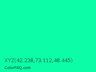 XYZ 42.238,73.112,48.445 Color is a normal green color and the nearest color is Medium Spring Green #00fa9a. Hex code #0bfda7 and RGB value is rgb(11,253,167). In RGB color space, this color is composed of 4% red, 99% green, 65% blue, In CMYK color space, this color is composed of 96% cyan, 0% magenta, 34% yellow , 1% black , In HSL color space, this color has a hue angle of 159° , 98% saturation and 52% lightness.