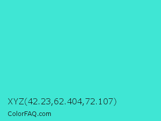 XYZ 42.23,62.404,72.107 Color is a normal cyan color and the nearest color is Turquoise #40e0d0. Hex code #3fe6d4 and RGB value is rgb(63,230,212). In RGB color space, this color is composed of 25% red, 90% green, 83% blue, In CMYK color space, this color is composed of 73% cyan, 0% magenta, 8% yellow , 10% black , In HSL color space, this color has a hue angle of 174° , 77% saturation and 57% lightness.