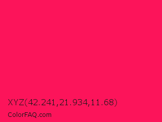 XYZ 42.241,21.934,11.68 Color is a normal rose color and the nearest color is Awesome #ff2052. Hex code #fc145a and RGB value is rgb(252,20,90). In RGB color space, this color is composed of 99% red, 8% green, 35% blue, In CMYK color space, this color is composed of 0% cyan, 92% magenta, 64% yellow , 1% black , In HSL color space, this color has a hue angle of 342° , 97% saturation and 53% lightness.