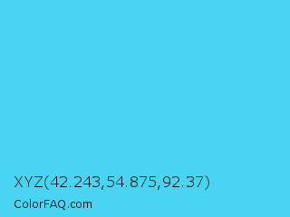 XYZ 42.243,54.875,92.37 Color is a light cyan color and the nearest color is Picton Blue #45b1e8. Hex code #48d4f2 and RGB value is rgb(72,212,242). In RGB color space, this color is composed of 28% red, 83% green, 95% blue, In CMYK color space, this color is composed of 70% cyan, 12% magenta, 0% yellow , 5% black , In HSL color space, this color has a hue angle of 191° , 87% saturation and 62% lightness.