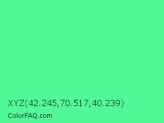XYZ 42.245,70.517,40.239 Color is a light green color and the nearest color is Very Light Malachite Green #64e986. Hex code #52f796 and RGB value is rgb(82,247,150). In RGB color space, this color is composed of 32% red, 97% green, 59% blue, In CMYK color space, this color is composed of 67% cyan, 0% magenta, 39% yellow , 3% black , In HSL color space, this color has a hue angle of 145° , 91% saturation and 65% lightness.