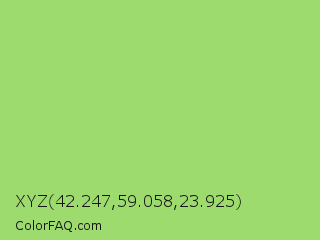 XYZ 42.247,59.058,23.925 Color is a light green color and the nearest color is Pistachio #93c572. Hex code #9edb6e and RGB value is rgb(158,219,110). In RGB color space, this color is composed of 62% red, 86% green, 43% blue, In CMYK color space, this color is composed of 28% cyan, 0% magenta, 50% yellow , 14% black , In HSL color space, this color has a hue angle of 94° , 60% saturation and 65% lightness.