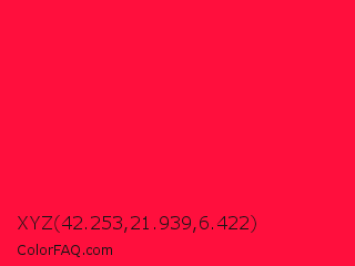 XYZ 42.253,21.939,6.422 Color is a normal red color and the nearest color is Torch Red #fd0e35. Hex code #ff0f3d and RGB value is rgb(255,15,61). In RGB color space, this color is composed of 100% red, 6% green, 24% blue, In CMYK color space, this color is composed of 0% cyan, 94% magenta, 76% yellow , 0% black , In HSL color space, this color has a hue angle of 349° , 100% saturation and 53% lightness.
