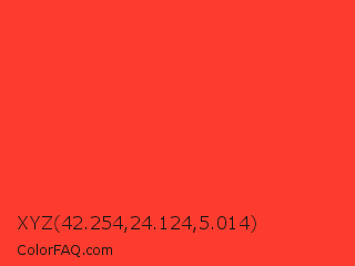 XYZ 42.254,24.124,5.014 Color is a normal red color and the nearest color is Red Orange #ff3f34. Hex code #fc3c2e and RGB value is rgb(252,60,46). In RGB color space, this color is composed of 99% red, 24% green, 18% blue, In CMYK color space, this color is composed of 0% cyan, 76% magenta, 82% yellow , 1% black , In HSL color space, this color has a hue angle of 4° , 97% saturation and 58% lightness.