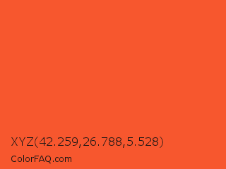 XYZ 42.259,26.788,5.528 Color is a normal red color and the nearest color is Flamingo #f2552a. Hex code #f7572e and RGB value is rgb(247,87,46). In RGB color space, this color is composed of 97% red, 34% green, 18% blue, In CMYK color space, this color is composed of 0% cyan, 65% magenta, 81% yellow , 3% black , In HSL color space, this color has a hue angle of 12° , 93% saturation and 57% lightness.
