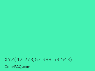 XYZ 42.273,67.988,53.543 Color is a light green color and the nearest color is Eucalyptus #44d7a8. Hex code #44f2b3 and RGB value is rgb(68,242,179). In RGB color space, this color is composed of 27% red, 95% green, 70% blue, In CMYK color space, this color is composed of 72% cyan, 0% magenta, 26% yellow , 5% black , In HSL color space, this color has a hue angle of 158° , 87% saturation and 61% lightness.