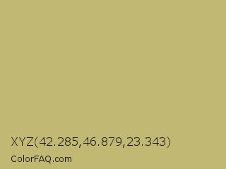 XYZ 42.285,46.879,23.343 Color is a light yellow color and the nearest color is Misty Moss #bbb477. Hex code #c1b874 and RGB value is rgb(193,184,116). In RGB color space, this color is composed of 76% red, 72% green, 45% blue, In CMYK color space, this color is composed of 0% cyan, 5% magenta, 40% yellow , 24% black , In HSL color space, this color has a hue angle of 53° , 38% saturation and 61% lightness.