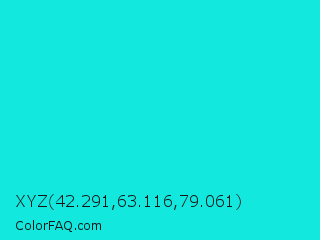 XYZ 42.291,63.116,79.061 Color is a normal cyan color and the nearest color is Bright Turquoise #08e8de. Hex code #12e8de and RGB value is rgb(18,232,222). In RGB color space, this color is composed of 7% red, 91% green, 87% blue, In CMYK color space, this color is composed of 92% cyan, 0% magenta, 4% yellow , 9% black , In HSL color space, this color has a hue angle of 177° , 86% saturation and 49% lightness.