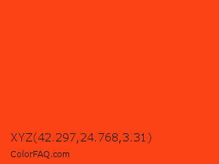 XYZ 42.297,24.768,3.31 Color is a normal red color and the nearest color is Orioles Orange #fb4f14. Hex code #fc4316 and RGB value is rgb(252,67,22). In RGB color space, this color is composed of 99% red, 26% green, 9% blue, In CMYK color space, this color is composed of 0% cyan, 73% magenta, 91% yellow , 1% black , In HSL color space, this color has a hue angle of 12° , 97% saturation and 54% lightness.