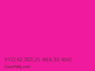 XYZ 42.305,21.664,33.404 Color is a normal magenta color and the nearest color is Fluorescent Pink #ff1493. Hex code #f01a9c and RGB value is rgb(240,26,156). In RGB color space, this color is composed of 94% red, 10% green, 61% blue, In CMYK color space, this color is composed of 0% cyan, 89% magenta, 35% yellow , 6% black , In HSL color space, this color has a hue angle of 324° , 88% saturation and 52% lightness.